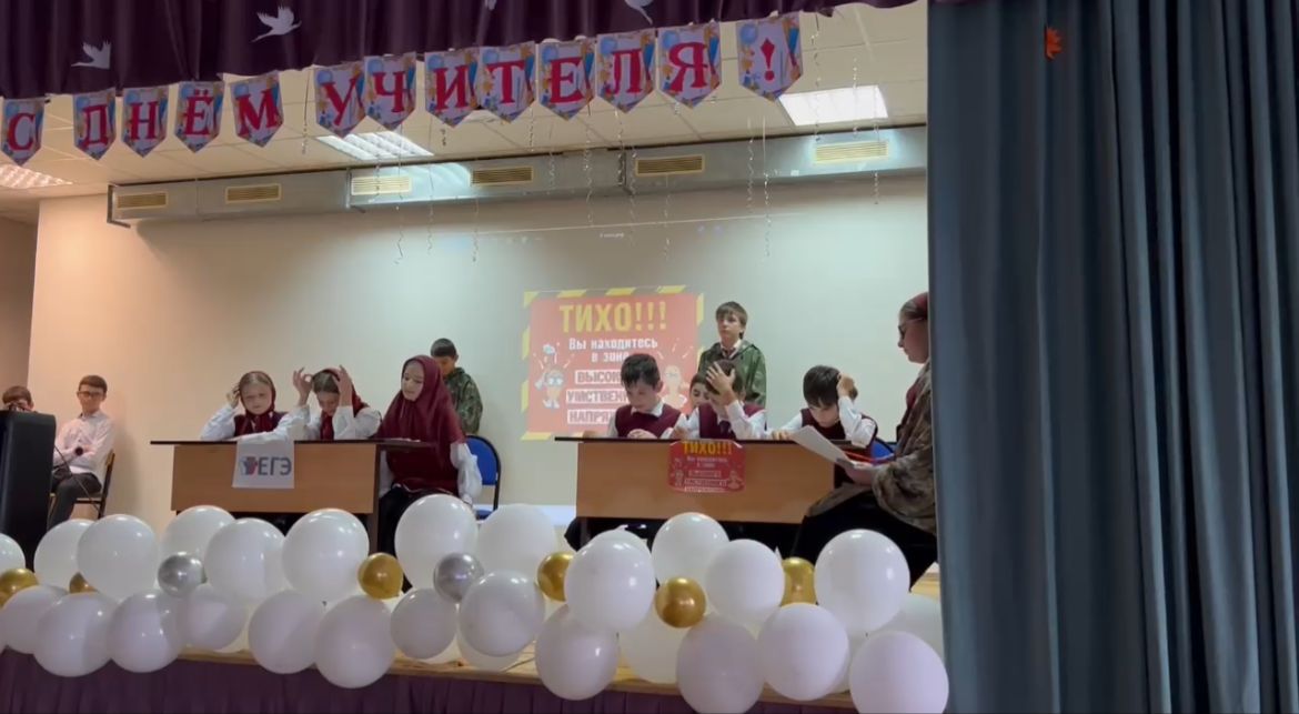 Участники театрального кружка "Театр-творчество-дети" выступают на мероприятии посвященном Дню учителя.