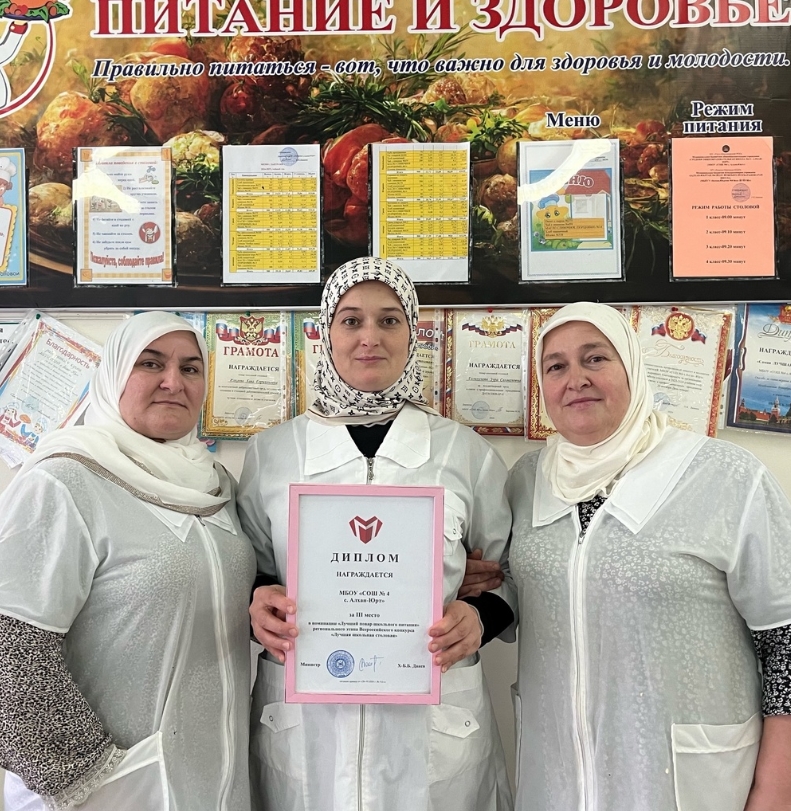 02.12.2024ЛУЧШАЯ ШКОЛЬНАЯ СТОЛОВАЯ Школьная столовая — это особое место в школе, где ученики проводят перемены, отдыхают и общаются.Когда было получено положение Всероссийского конкурса «Лучшая школьная столовая -2024»,администрацией МБОУ «СОШ № 4 с.Алхан-Юрт» было принято решение принять участие в этом конкурсе. Члены жюри управления образования высоко оценили работу нашей столовой.По итогам конкурса столовая МБОУ «СОШ № 4 с.Алхан-Юрт» стала победителем регионального этапа Всероссийского конкурса «Лучшая школьная столовая-2024» в номинации «Лучший повар школьного питания».Выражаем благодарность поварам нашей школы Газихановой Зуре Салмановне, Газихановой Элине Сайд-Эминовне и Какаевой Хаве Гарчхановной.Желаем успехов в работе и дальнейшего профессионального роста!